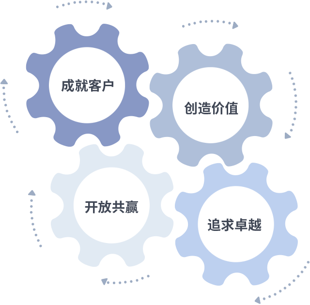 成就客户是一切决策的出发点,,,创造价值是衡量所有工作的标准,,,,追求卓越是我们做事做人的态度,,,,开放共赢是我们的格局也是最终的结果。。。。价值观的齿轮环环相扣,,,,推动着组织里的每个人不断向前。。